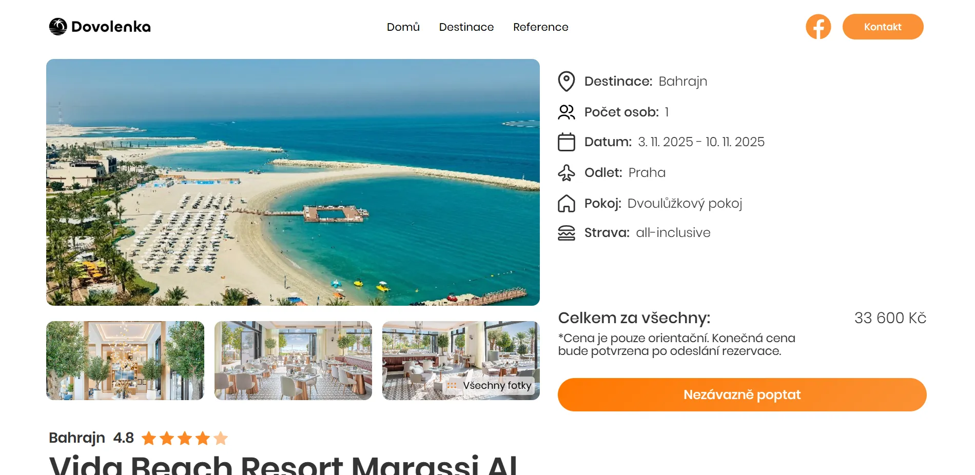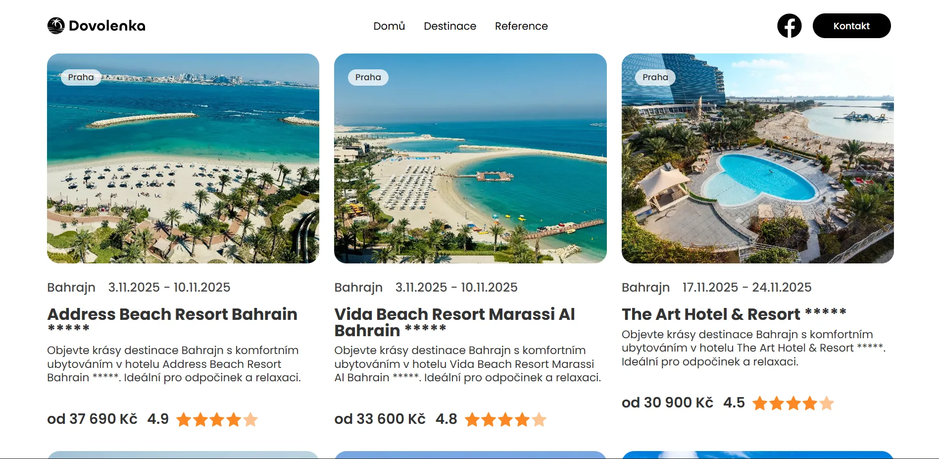 Každý zájezd má vlastní dynamickou podstránku s popisem, obrázky, itinerářem a tlačítkem pro rezervaci. Odeslané rezervace jsou doručovány přímo agentuře a zpracovávány bez nutnosti manuální komunikace přes sociální sítě.