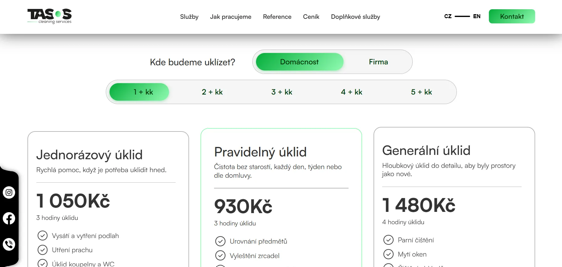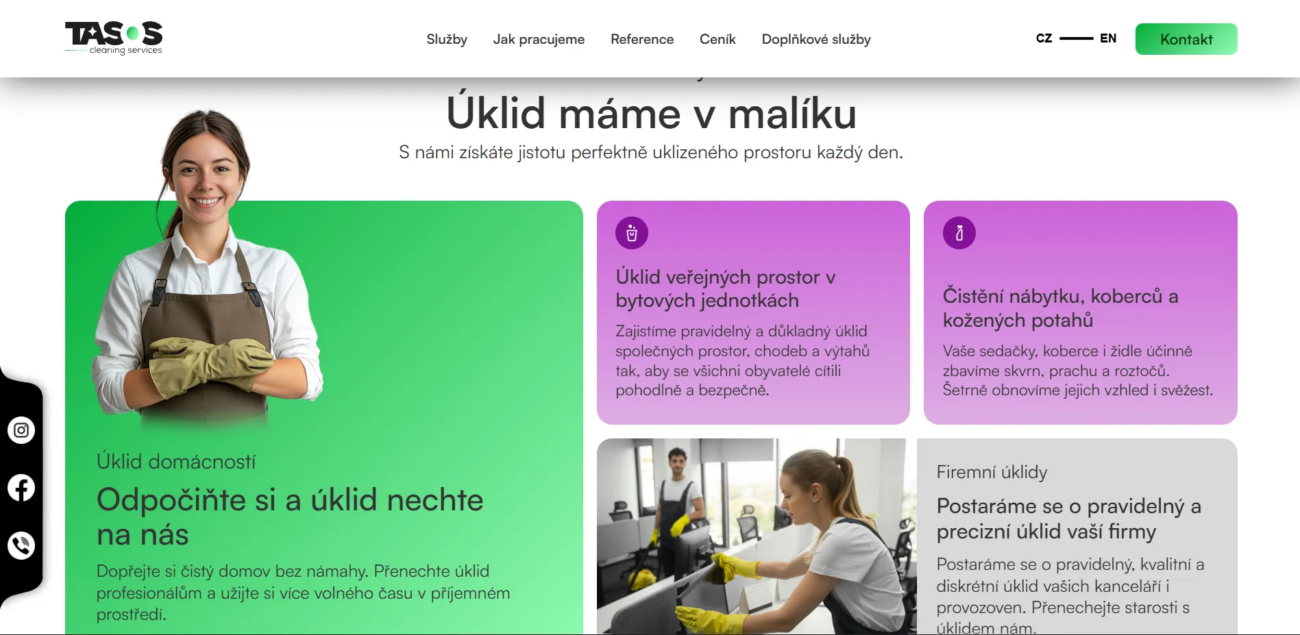 Web Tasos Úklid poskytuje nové značce stabilní základ pro online akvizici zákazníků. Jednoduchá struktura, přehled služeb, vlastní kalkulačka a snadná objednávka zvyšují pravděpodobnost přímé poptávky bez nutnosti telefonického ověřování. Díky vizuální identitě působí značka jednotně a profesionálně, a to i přes to, že se jedná o nový projekt na trhu.