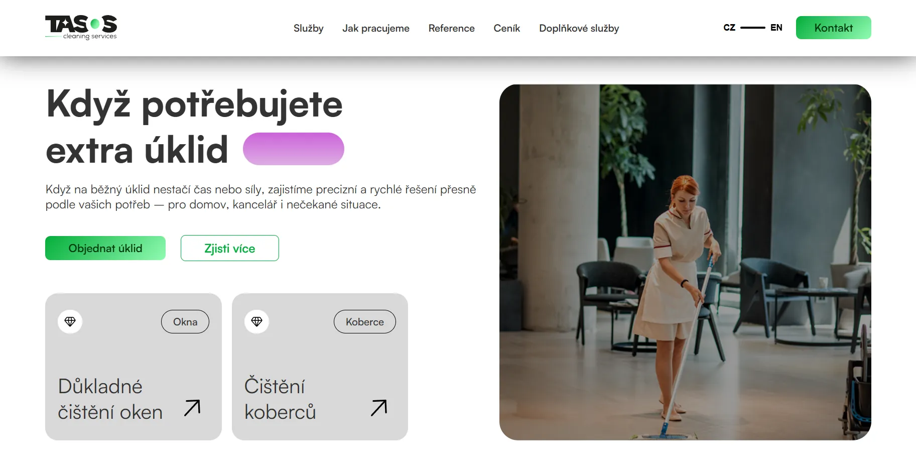 Majitel společnosti Tasos, Miroslav Ostruzska, nás po úspěšné realizaci webu pro stěhovací služby oslovil s novým záměrem. Rozhodl se rozšířit podnikání do oblasti profesionálního úklidu a potřeboval kompletně nový projekt – značku, web i marketingový základ. Cílem nebylo vytvořit pouze prezentační stránku, ale plnohodnotný online nástroj pro získávání poptávek.